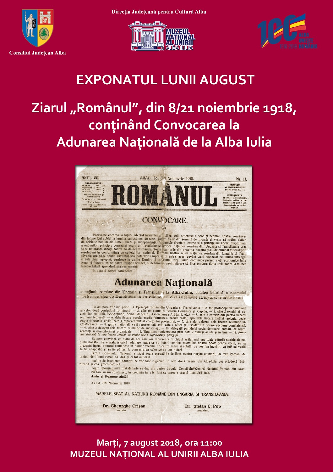 Alba-Iulia: Exponatul Lunii August: Ziarul „Românul” din 8/21 noiembrie 1918 conținând Convocarea la Adunarea Națională de la Alba Iulia