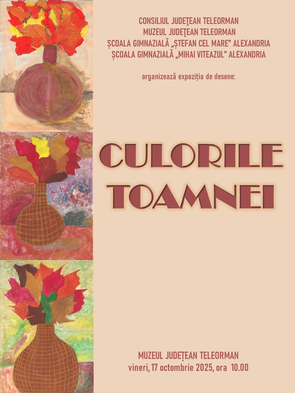 Muzeul Judeţean Teleorman, instituţie de cultură aflată sub autoritatea Consiliului Judeţean Teleorman, deschide vineri, 17 octombrie 2025, ora 10.00, expoziția „Culorile toamnei”.