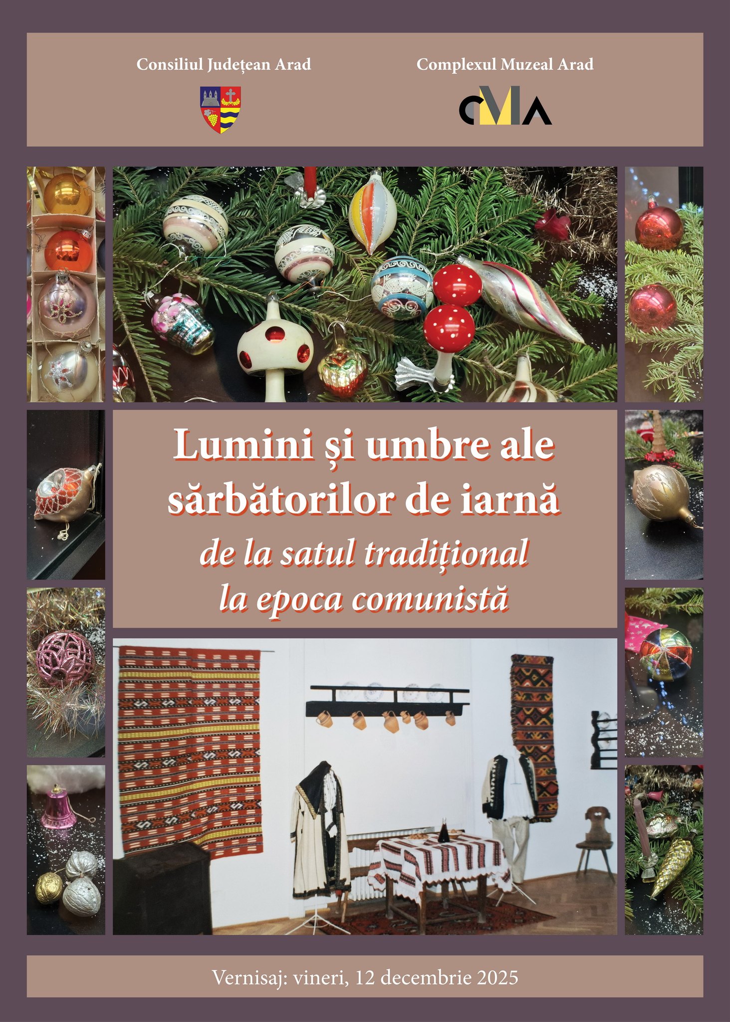 Expoziția „Lumini și umbre ale sărbătorilor de iarnă – de la satul tradițional la epoca comunistă” este deschisă la Complexul Muzeal Arad (Palatul Cultural Arad – Piața George Enescu 1, intrarea dinspre Piața George Enescu) până vineri, 16 ianuarie 2026.