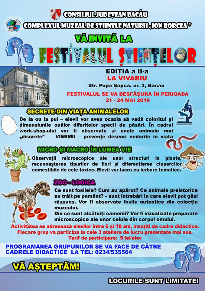 • în perioada 21 – 24 mai 2019 vor fi realizate activități la Vivariu;