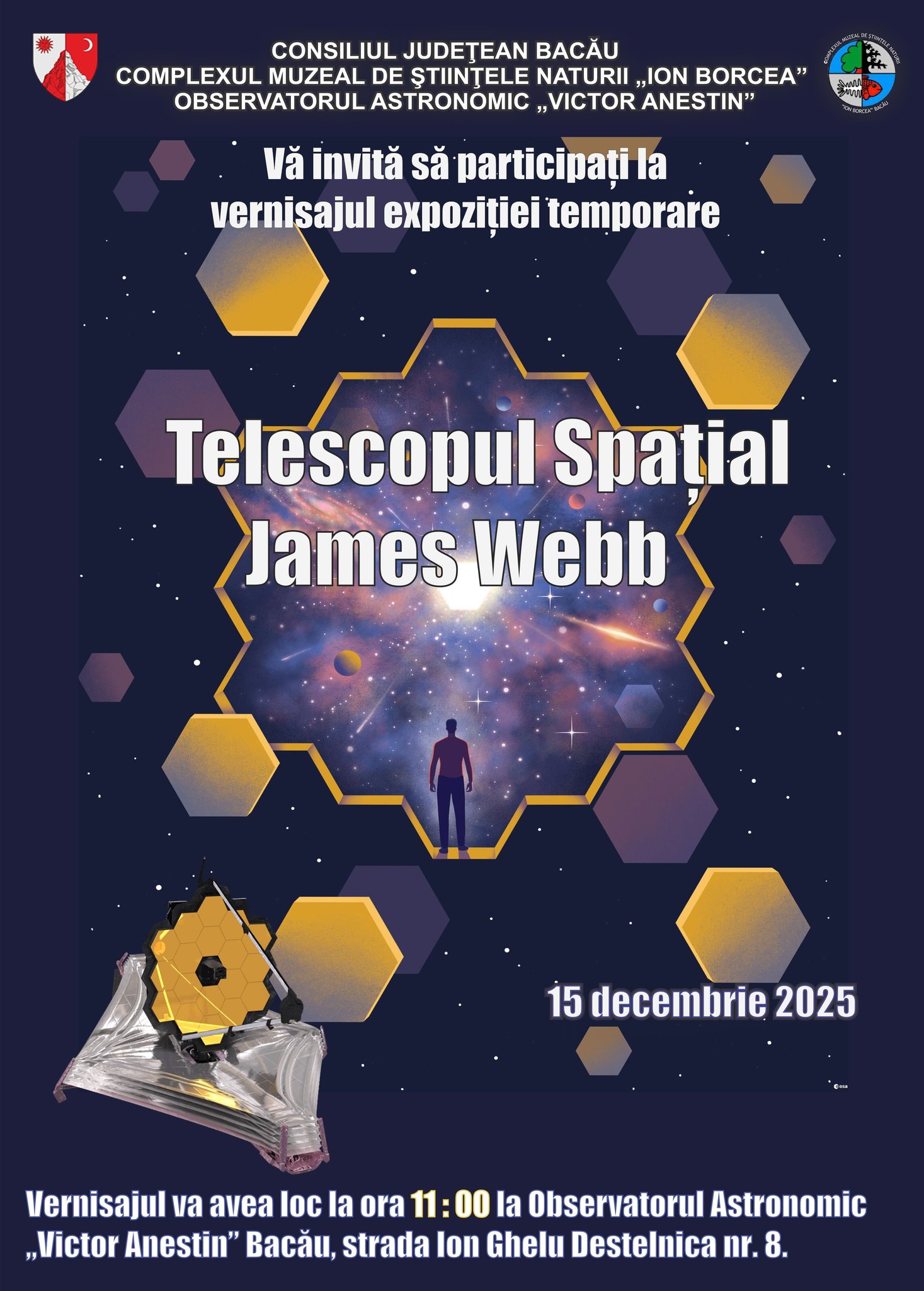 Complexul Muzeal de Științele Naturii „Ion Borcea” Bacău, vă invită în data de 15 decembrie, ora 11.00, la sediul Observatorului Astronomic „Victor Anestin” din str. Ion Ghelu Destelnica nr. 8, să participaţi la vernisajul expoziției temporare intitulată „Telescopul Spațial James Webb”.