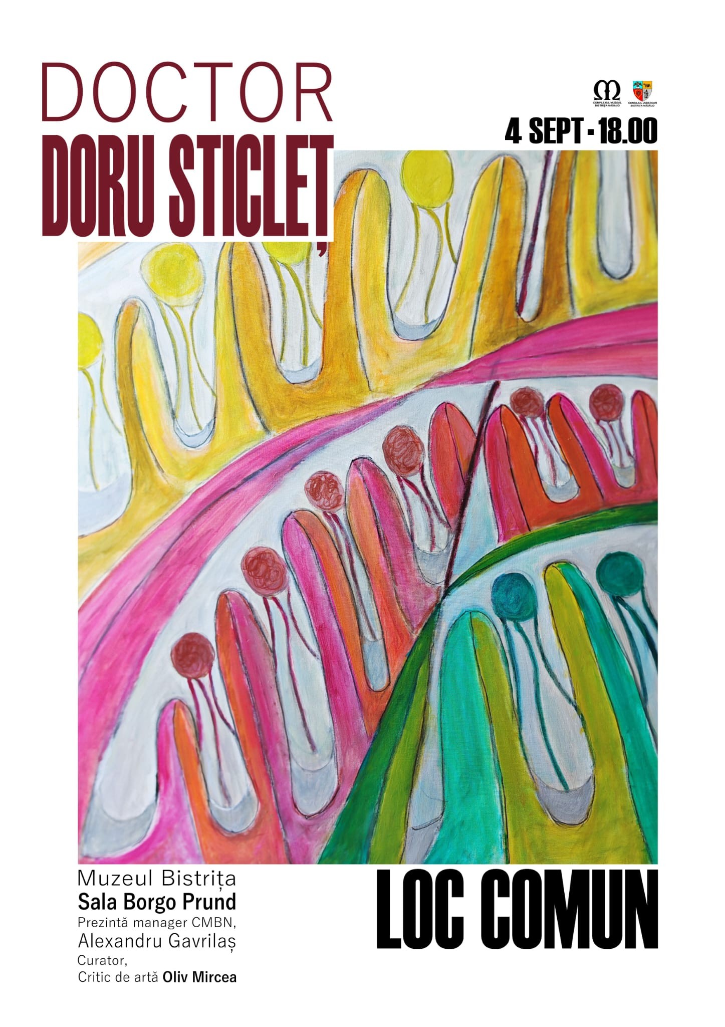 Complexul Muzeal Bistrița-Năsăud vă invită joi, 4 septembrie 2025, ora 18:00, în Sala Borgo Prund, la vernisajul expoziției personale de pictură și grafică „Loc comun”, semnată de Doru Sticleț, medic primar ginecolog și artist vizual.
