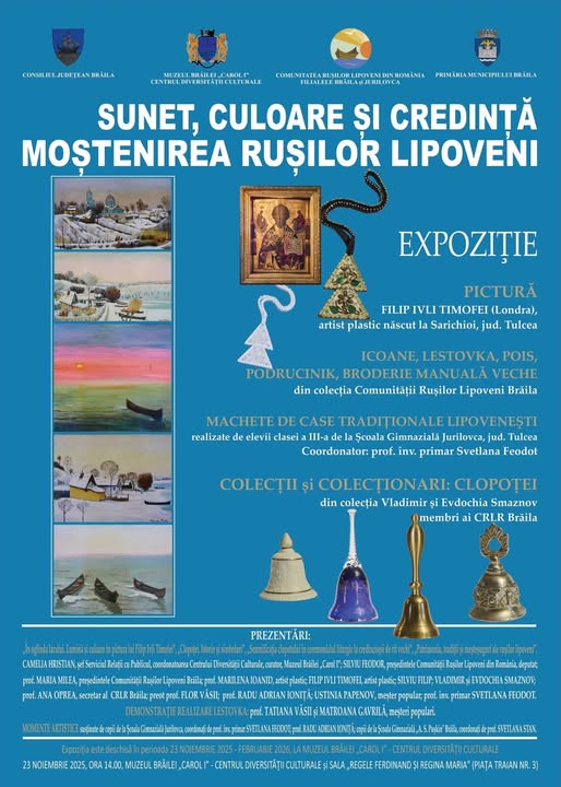 „SUNET, CULOARE ȘI CREDINȚĂ. MOȘTENIREA RUȘILOR LIPOVENI”. Vernisaj expoziție și prezentări – duminică, 23 noiembrie 2025, ora 14.00, la Muzeul Brăilei „Carol I” – Centrul Diversității Culturale și Sala „Regele Ferdinand și Regina Maria” (Piața Traian nr. 3).