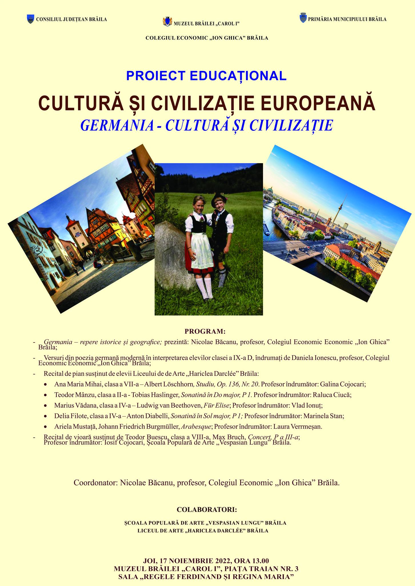 „Germania – cultură și civilizație”. Spectacol de muzică şi poezie – activitate în proiectul educaţional „Cultură și civilizație europeană” – organizat de Colegiul Economic „Ion Ghica” Brăila, în colaborare cu Liceul de Arte „Hariclea Darclée” Brăila și Școala Populară de Arte „Vespasian Lungu” Brăila – joi, 17 noiembrie 2022, ora 13, la sediul Muzeului Brăilei „Carol I”, sala „Regele Ferdinand și Regina Maria” (Piața Traian, nr. 3) .