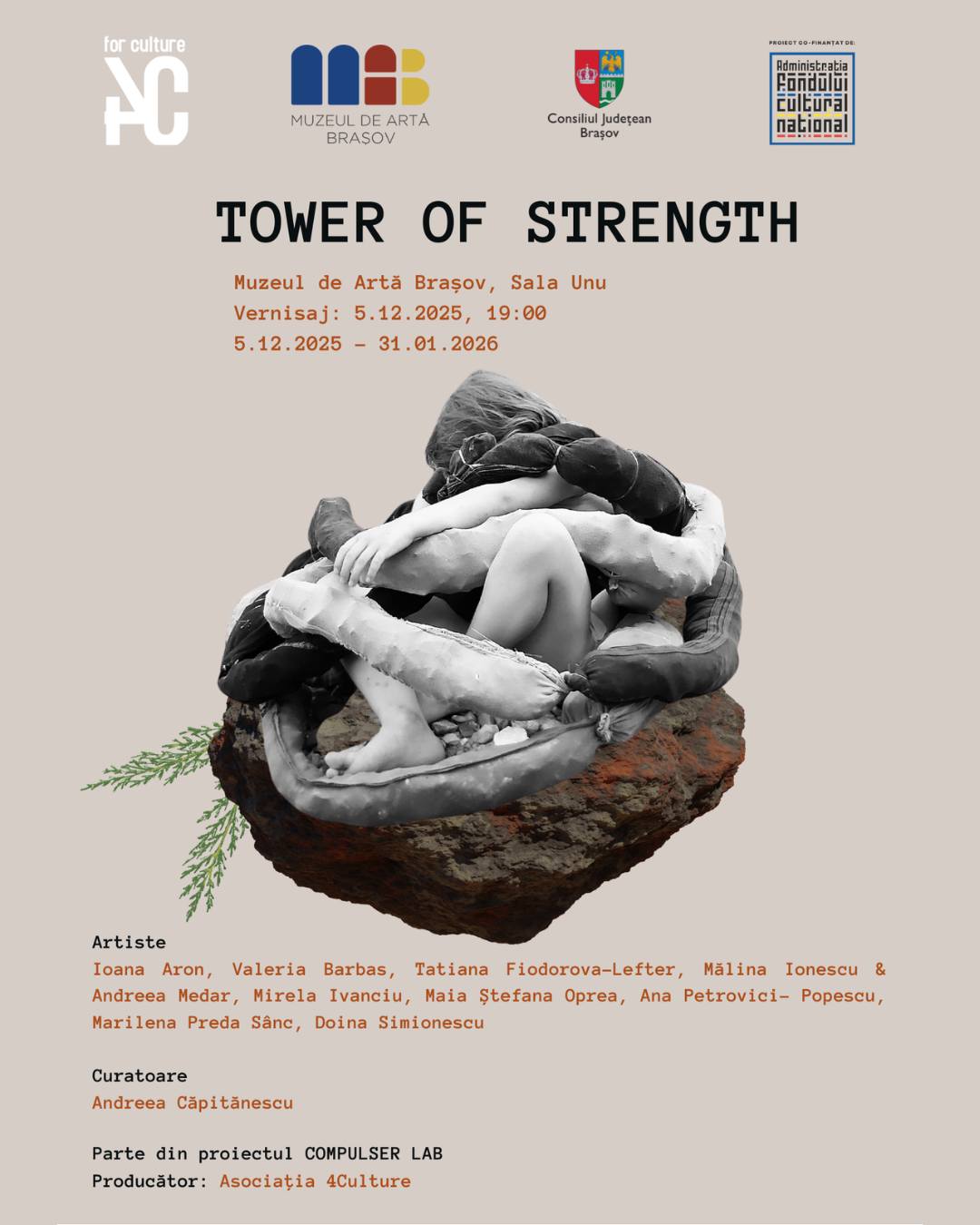 Muzeul de Artă Brașov și Asociația 4Culture vă invită vineri, 5 decembrie 2025, de la ora 19:00, la vernisajul expoziției de grup „Tower of Strength”, curatoriată de