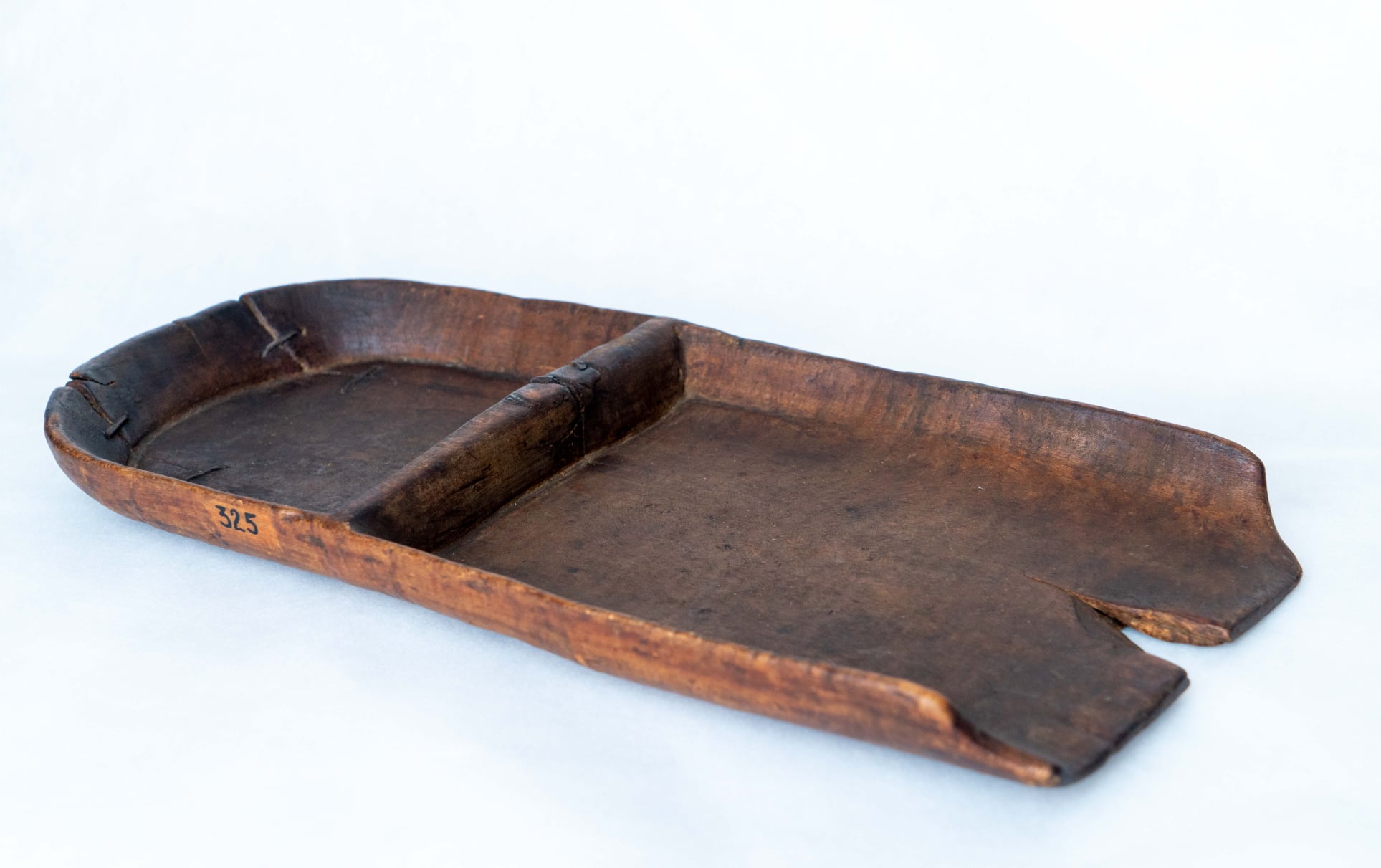 Copaia din imagine este o piesă monoxilă, adică realizată dintr-o singură bucată de lemn, de foioase, cu un compartiment mai mic la un capăt, pentru brânză.
