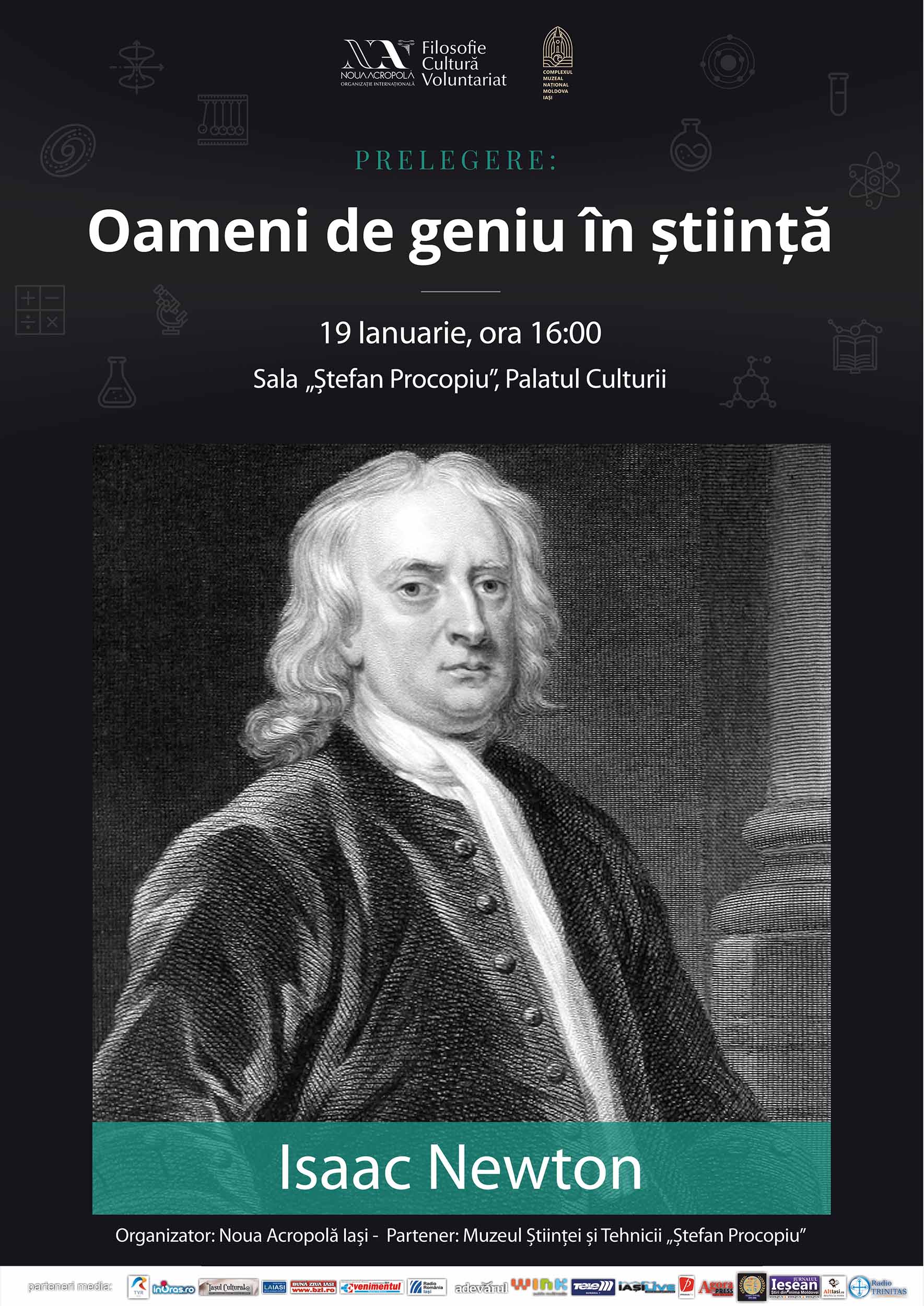 Seria evenimentelor „Oameni de geniu în știință”, organizate de Asociația „Noua Acropolă” Iași, în parteneriat cu Muzeul Științei și Tehnicii „Ștefan Procopiu” din cadrul Complexului Muzeal Național „Moldova” Iași, continuă sâmbătă, 19 ianuarie 2019, ora 16.00, în Sala „Ștefan Procopiu” de la Palatul Culturii, cu o prelegere dedicată lui Isaac Newton.