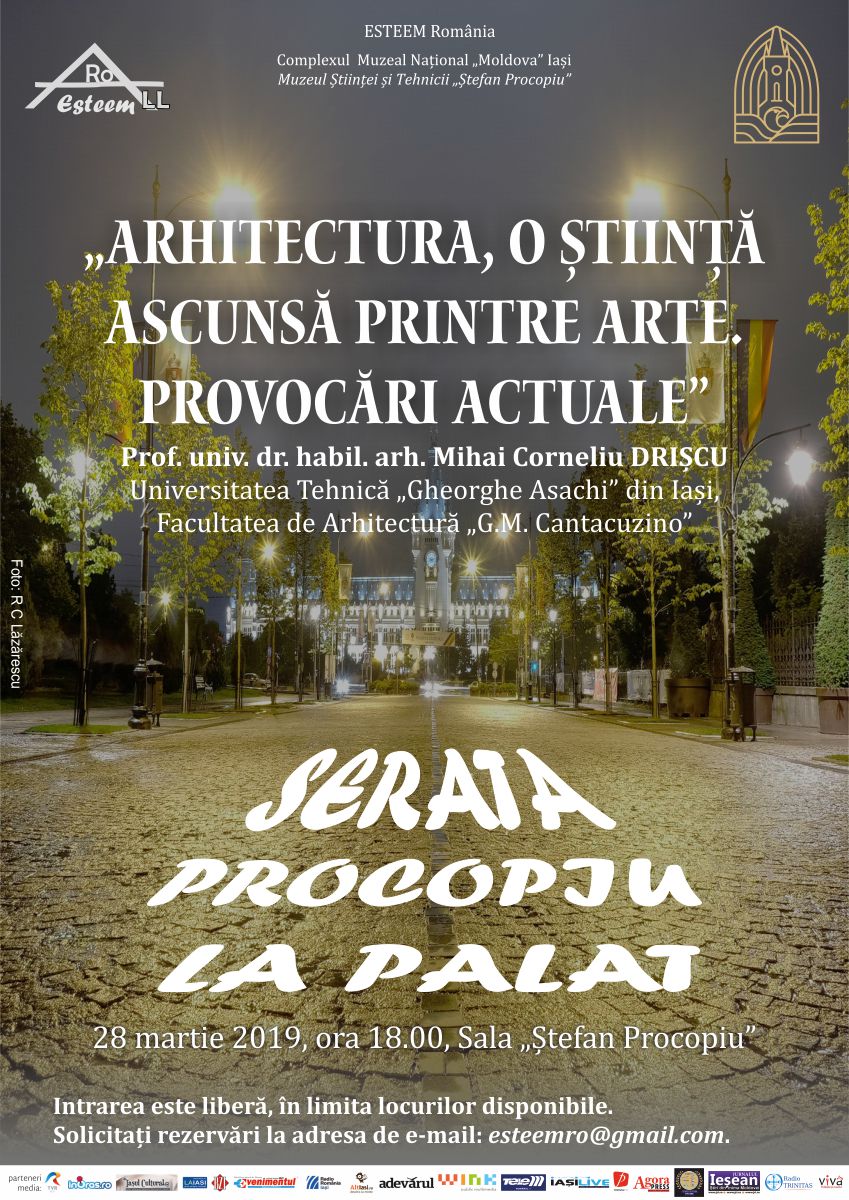 Complexul Muzeal Național „Moldova” Iaşi – Muzeul Ştiinţei şi Tehnicii „Ştefan Procopiu” şi Asociaţia „Aliance of Educators for Science, Technology, Engineering, Mathematics and Informatics” – ESTEEM România continuă seria Seratelor „Procopiu” la Palat, joi, 28 martie 2019, de la ora 18.00, cu o conferință pe tema „Arhitectura, o știință ascunsă printre arte. Provocări actuale”.