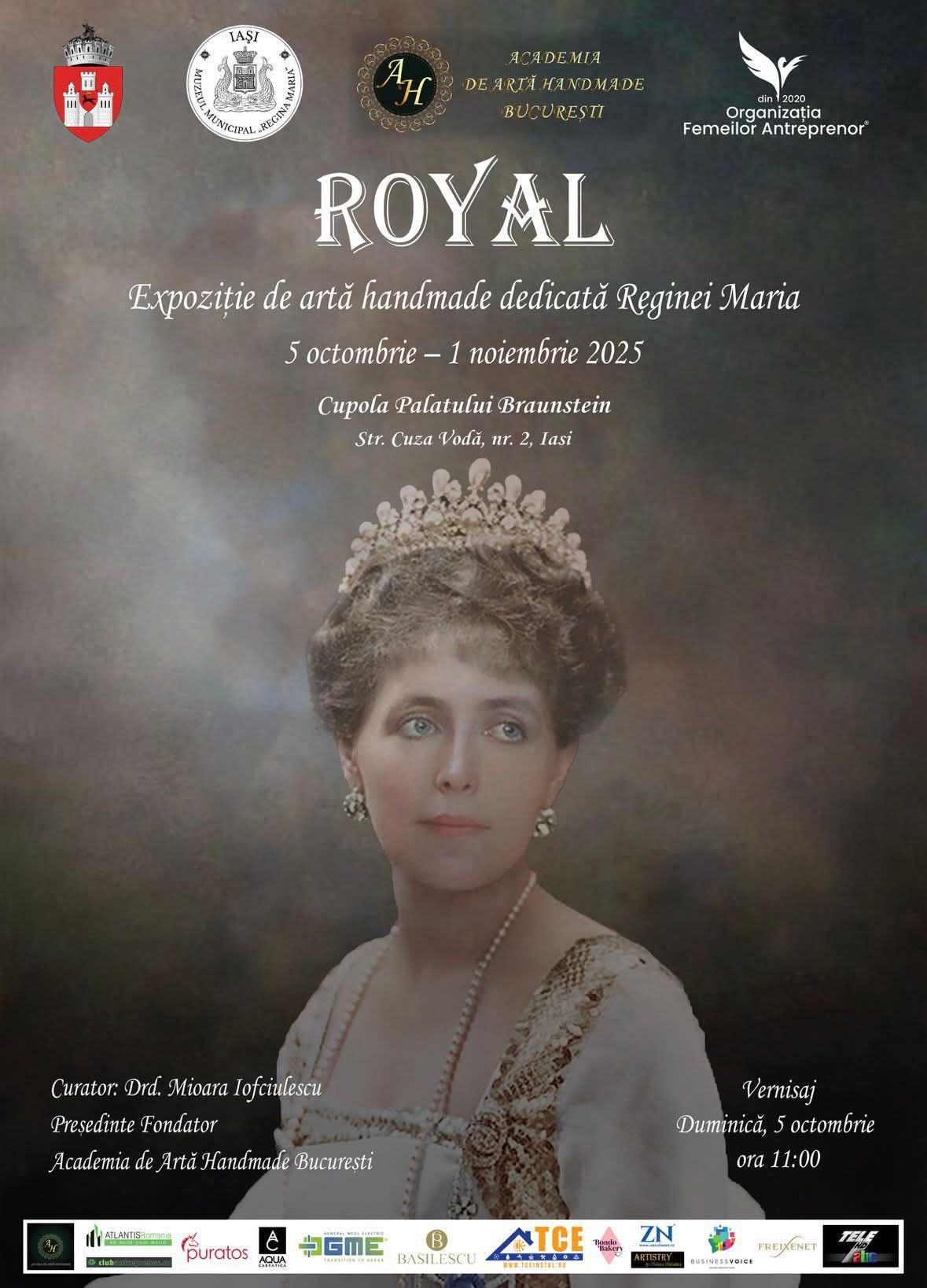 În perioada 5 octombrie – 1 noiembrie 2025, Palatul Braunstein din Iași va fi gazda expoziției de artă ROYAL, ce include 150 de lucrări inspirate din viața și activitatea Reginei Maria, realizate de 15 artiști români.