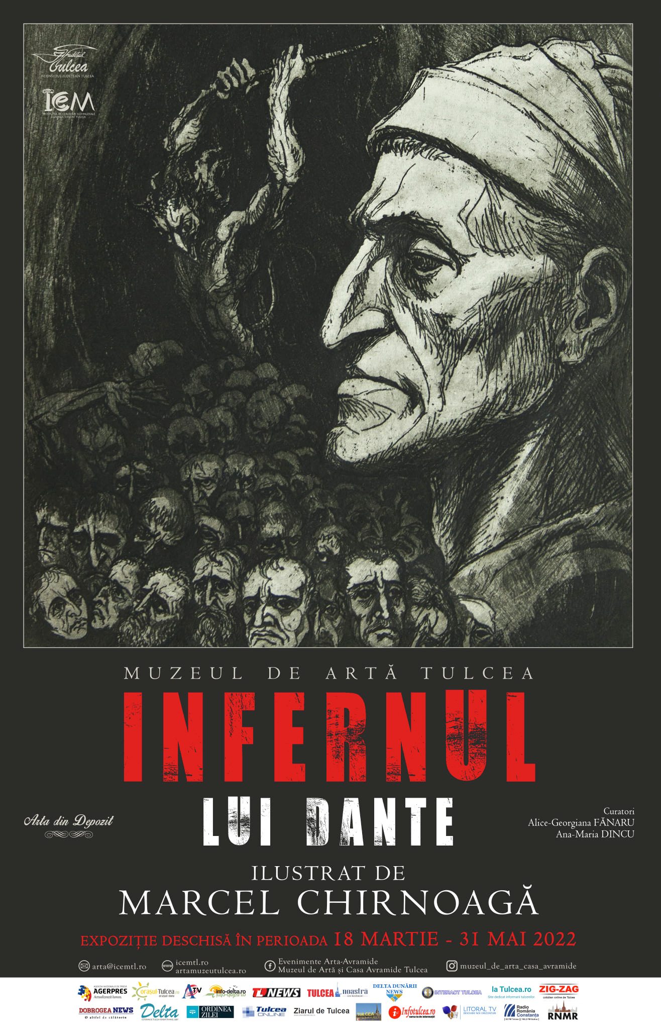 Cunoscutul și foarte apreciatul grafician român Marcel Chirnoagâ (1930-2008) a ilustrat în 21 de lucrări realizate în tehnici specifice gravurii, acvaforte și acvatinta, cele mai importante aspecte ale Infernului lui Dante Alighieri, prima parte a Divinei Comedii, alegorie în versuri redactată începând cu anul 1306. Artistul ne ajută prin gravurile sale să întreprindem, asemenea lui Dante, o călătorie imaginară spre centrul pământului, trecând prin aproape toate cercurile Infernului. Devenim astfel părtași ai drumului închipuit prin lumea celor damnați și suntem invitați să reflectăm la propria existență și locul pe care fiecare privitor și l-ar revendica sau asuma.