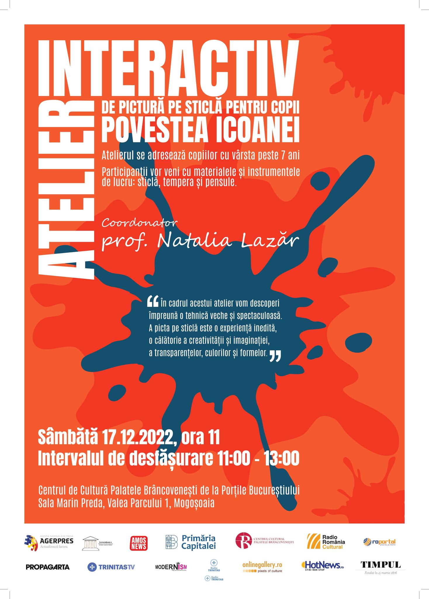 Atelierul interactiv debutează cu o prelegere despre tehnica iconografiei şi despre povestea icoanelor expuse în cadrul expoziției din sala Foișor. Apoi, copiii participanți la atelier vor fi îndrumați să descopere tainele acestui meșteșug străvechi – pictura tradițională a icoanei pe sticlă.