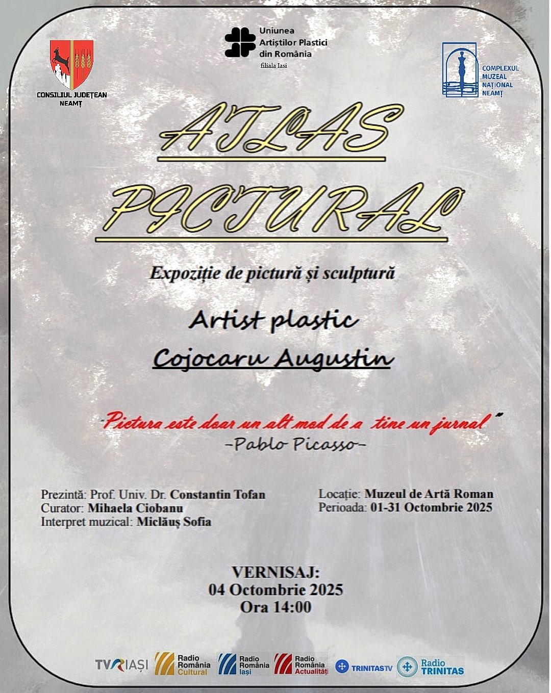 Începând cu 4 octombrie, Muzeul de Artă din Roman găzduiește o nouă expoziție personală. O provocare vizuală, un ”Atlas pictural”, la care ne invită artistul plastic băcăoan, Augustin Cojocaru. O prezentare generoasă ca tematică, stil și tehnică, care dezvăluie parcursul plastic al unui artist care și-a completat, într-un mod aparte, cu o ambiție de invidiat, pasiunea de-o viață. Cu începuturi timide, cu un talent moștenit de-acasă, unde tatăl său, făuritor de frumos în arta lemnului, i-a insuflat primele încercări de a modela, Augustin Cojocaru, organizat și metodic, și-a dus visul spre îndeplinire.