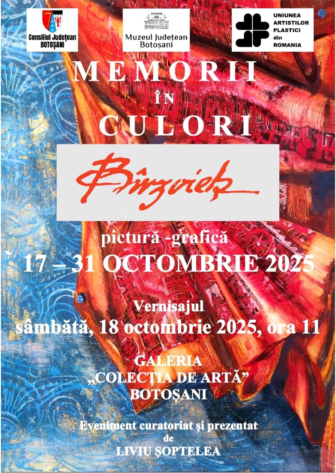 Muzeul Județean Botoșani găzduiește, în perioada 17-31 octombrie 2025, în spațiul Galeriei ,,Colecția de Artă”, expoziția de pictură și grafică ,,Memorii în culori”, o nouă „personală” a artistului botoșănean Cristian Bîrzoieș.