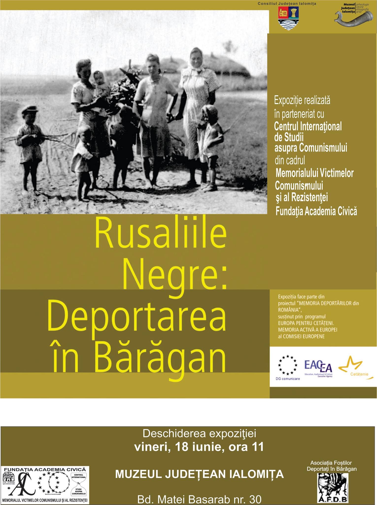 Expoziția este realizată de Muzeul Județean Ialomița, în parteneriat cu Fundația Academia Civică și cu Asociația Foștilor Deportați în Bărăgan. Expoziția itinerantă foto-documentară ,,Rusaliile Negre: deportarea în Bărăgan” cuprinde 28 de panouri expuse cronologic și tematic. Aceasta aparține Centrului Internațional de Studii asupra Comunismului din cadrul Memorialului Victimelor Comunismului și al Rezistenței – Fundația Academia Civică.