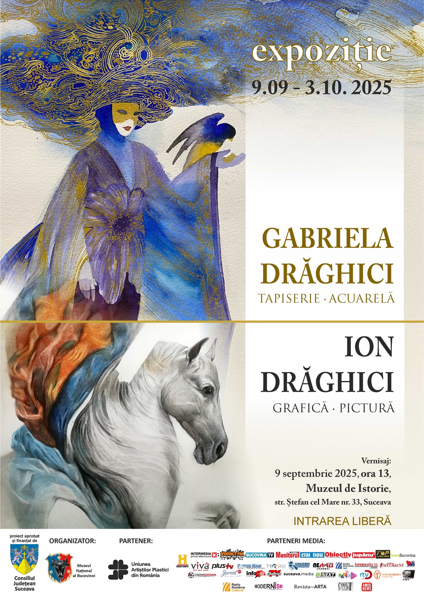 Muzeul Național al Bucovinei vă invită, marți, 9 septembrie 2025, ora 13, la Muzeul de Istorie din Suceava, la vernisajul expoziției artiștilor plastici Gabriela și Ion Drăghici, membri ai Uniunii Artiștilor Plastici din București.