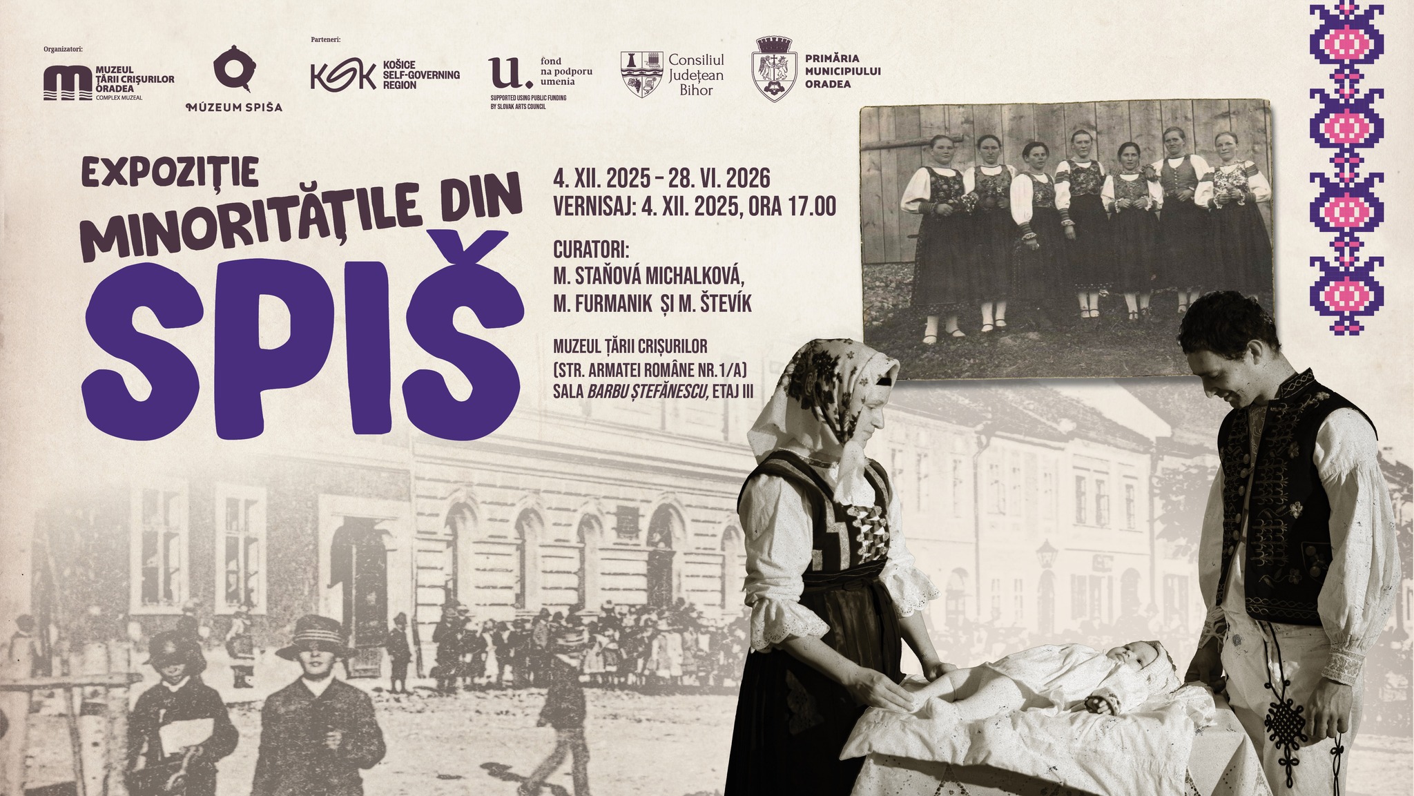Muzeul Țării Crișurilor Oradea – Complex Muzeal și Múzeum Spiša (Slovacia), în parteneriat cu Regiunea autonomă Košice (Slovacia), Consiliul Slovac pentru Susținerea Artei, Consiliul Județean Bihor și Primăria Municipiului Oradea, organizează vernisajul expoziției Minoritățile din Spiš. Evenimentul se va desfășura joi, 4 decembrie 2025, ora 17.00, în Sala Barbu Ștefănescu (etaj III), la Muzeul Țării Crișurilor (Str. Armatei Române nr. 1/A).