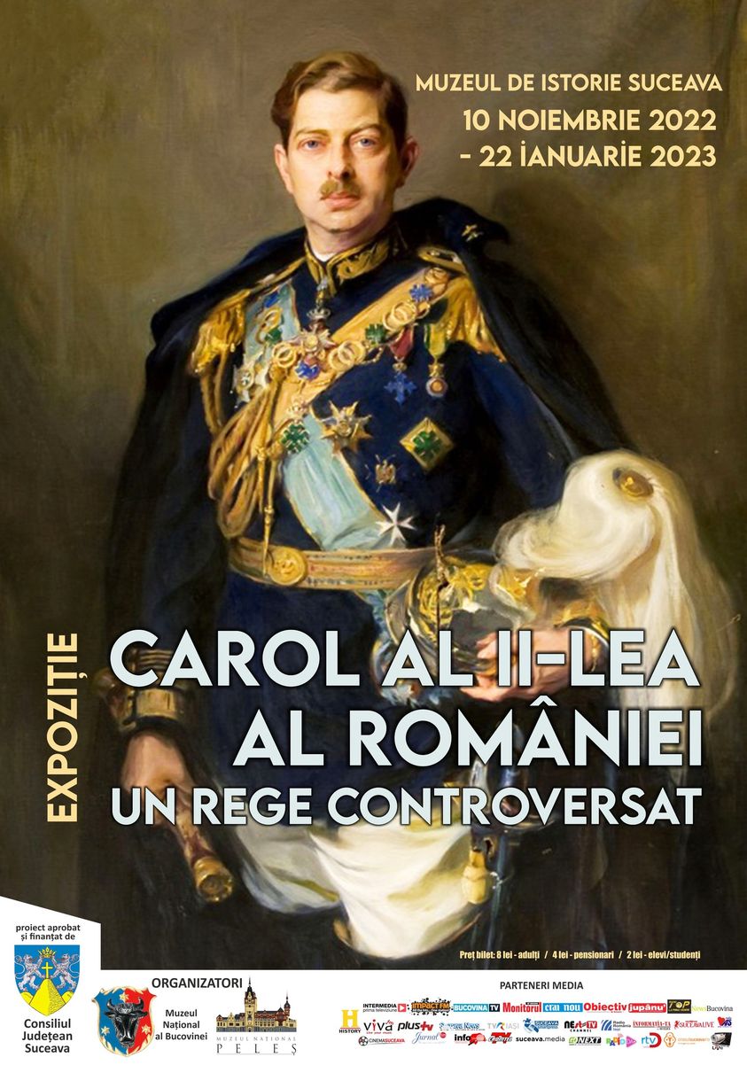 Suceava: În perioada 10 noiembrie 2022 – 22 ianuarie 2023, Muzeul Național al Bucovinei va găzdui expoziția temporară REGELE CAROL AL II-LEA AL ROMÂNIEI – UN REGE CONTROVERSAT, care prezintă piese de excepție din colecțiile cu Regele Carol al II-lea, aflate în patrimoniul Muzeului Național Peleș