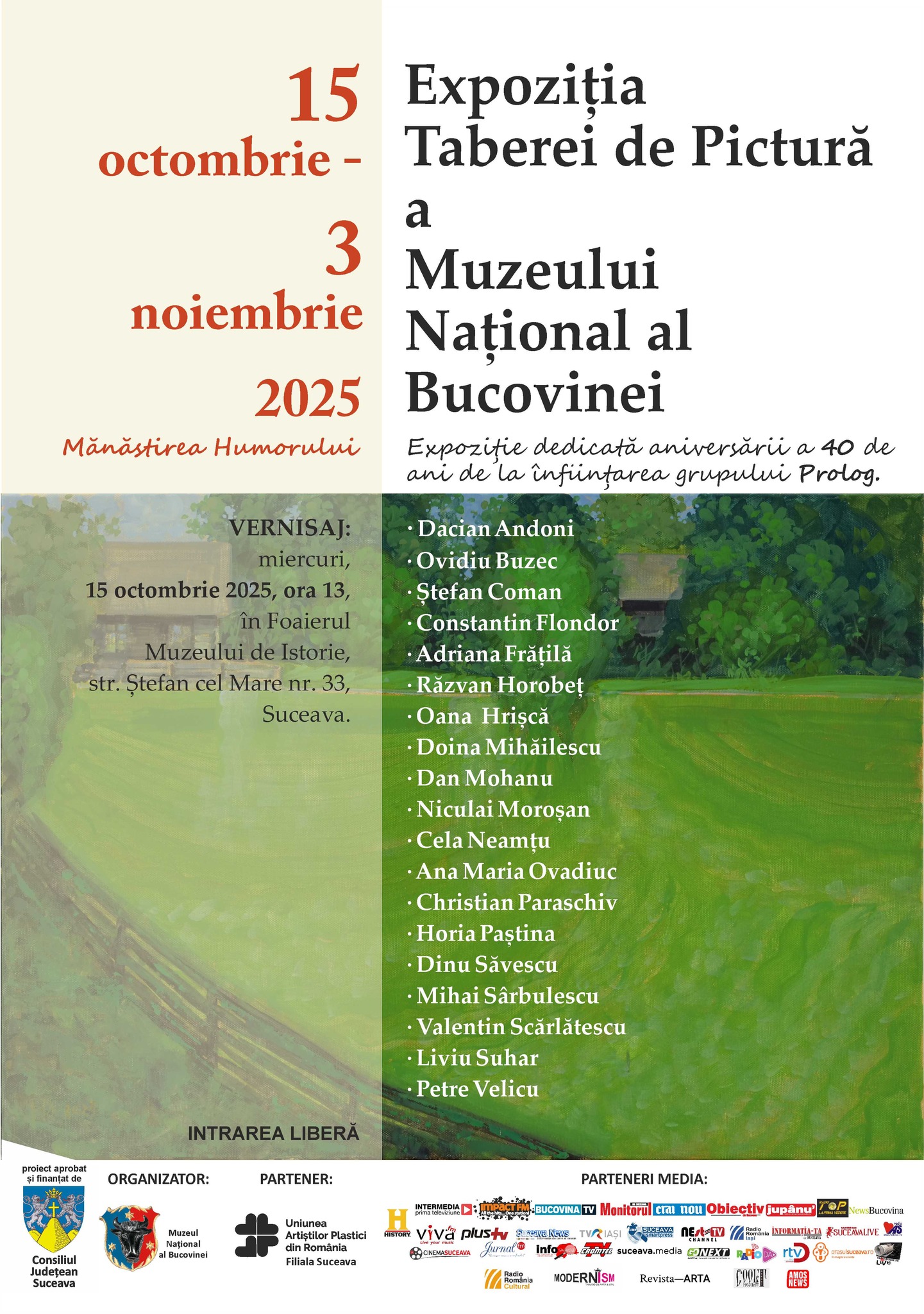 Muzeul Național al Bucovinei anunță deschiderea expoziției „Tabăra de pictură de la Mănăstirea Humorului – 2025” și invită publicul la vernisajul care va avea loc miercuri, 15 octombrie 2025, ora 13:00, în Foaierul Muzeului de Istorie, Str. Ștefan cel Mare nr. 33, Suceava.