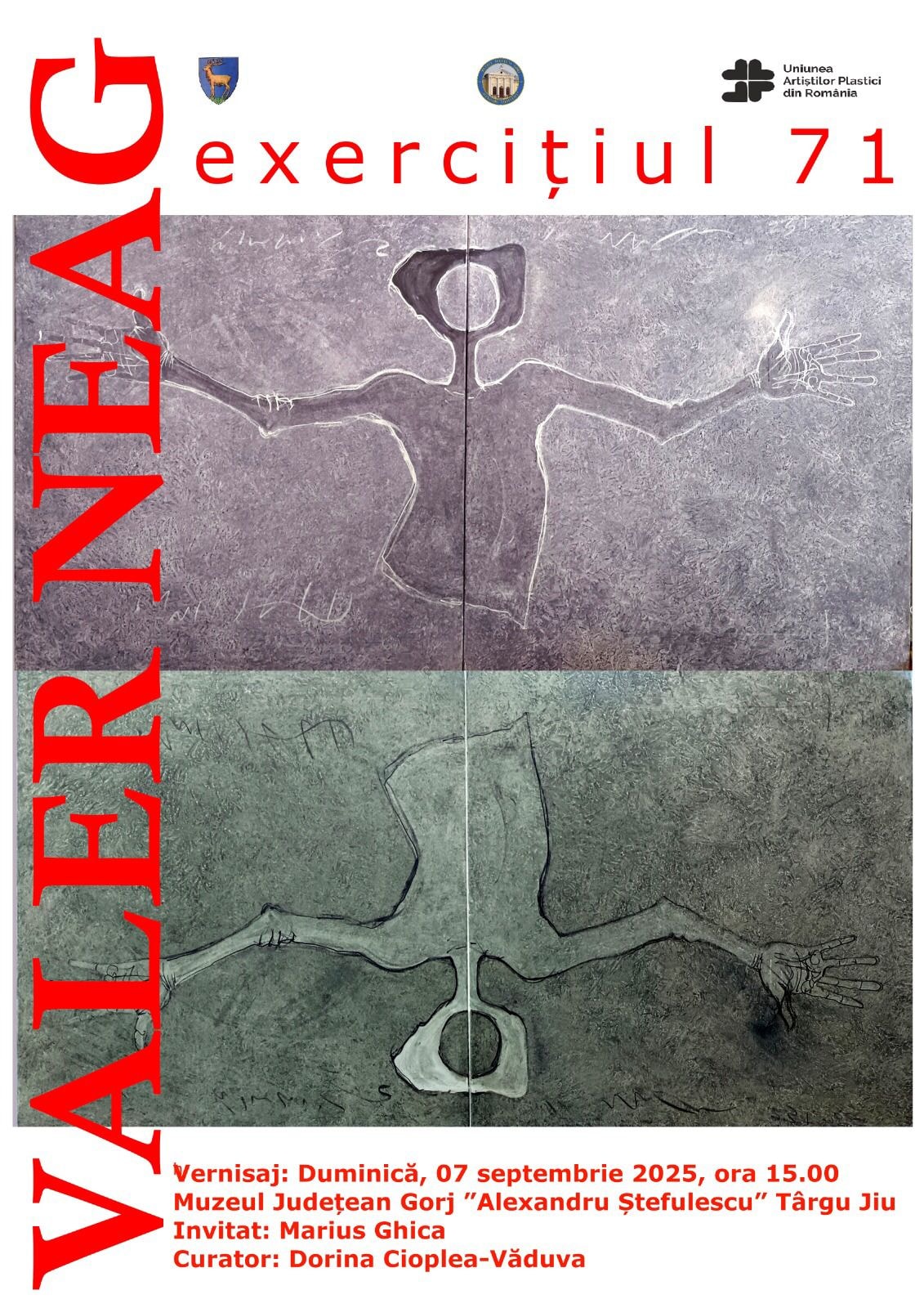 Duminică, 07 septembrie 2025, de la ora 15.00, la Muzeul Județean Gorj ”Alexandru Ștefulescu” din Târgu Jiu va avea loc vernisajul expoziției personale ”Exercițiul 71” a artistului Valer Neag. Invitat: Marius Ghica. Curator: Dorina Cioplea-Văduva.