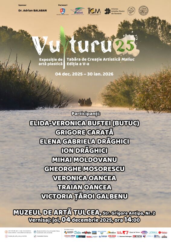 Complexul Muzeal de Patrimoniu Cultural Nord Dobrogean al Institutului de Cercetări Eco-Muzeale „Gavrilă Simion” Tulcea, Uniunea Artiștilor Plastici din România (Filiala București și Filiala Tulcea) și Dr. Adrian Balaban vă invită în perioada 4 decembrie 2025 – 30 ianuarie 2026 să vizitați expoziția colectivă de artă plastică intitulată „Vulturu 25”.