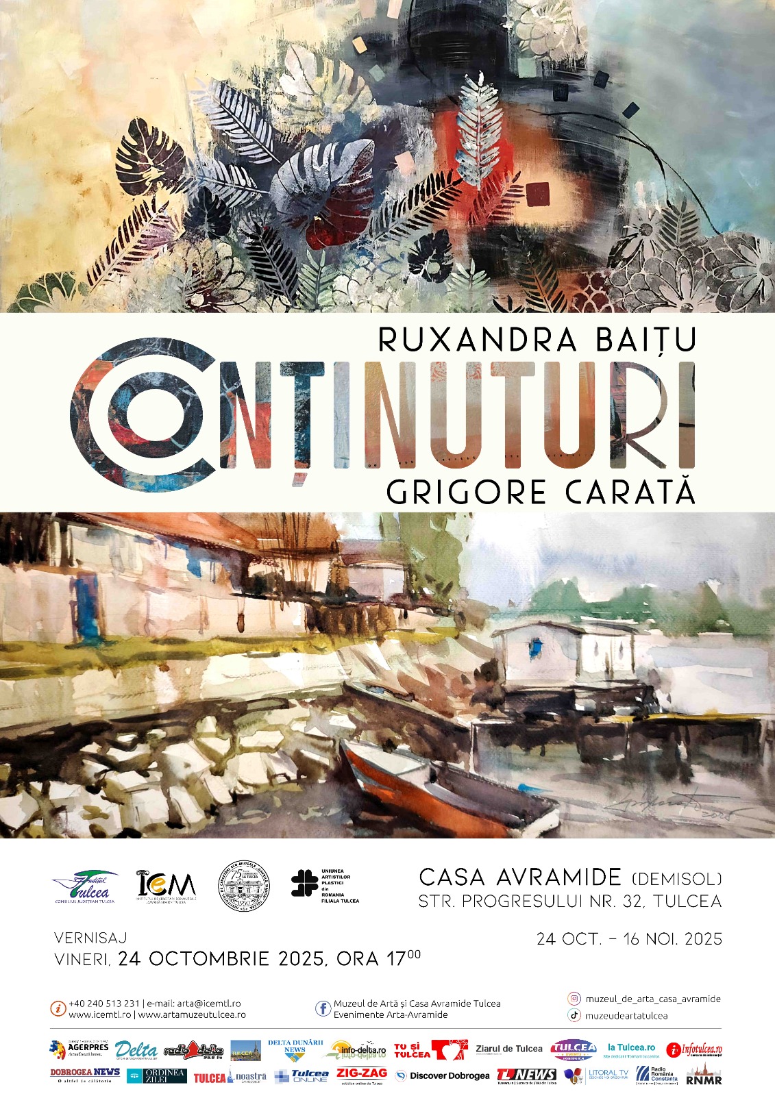 Două generații, o singură privire artistică: Vineri, 24 octombrie, de la ora 17:00, Casa Avramide din Tulcea găzduiește vernisajul expoziției „Con-ținuturi”, un tandem expozițional tată–fiică, semnat de Grigore Carată și Ruxandra Baițu. Lucrările celor doi artiști tulceni se întâlnesc într-un dialog vizual despre memorie, legături și formele personale ale continuității.